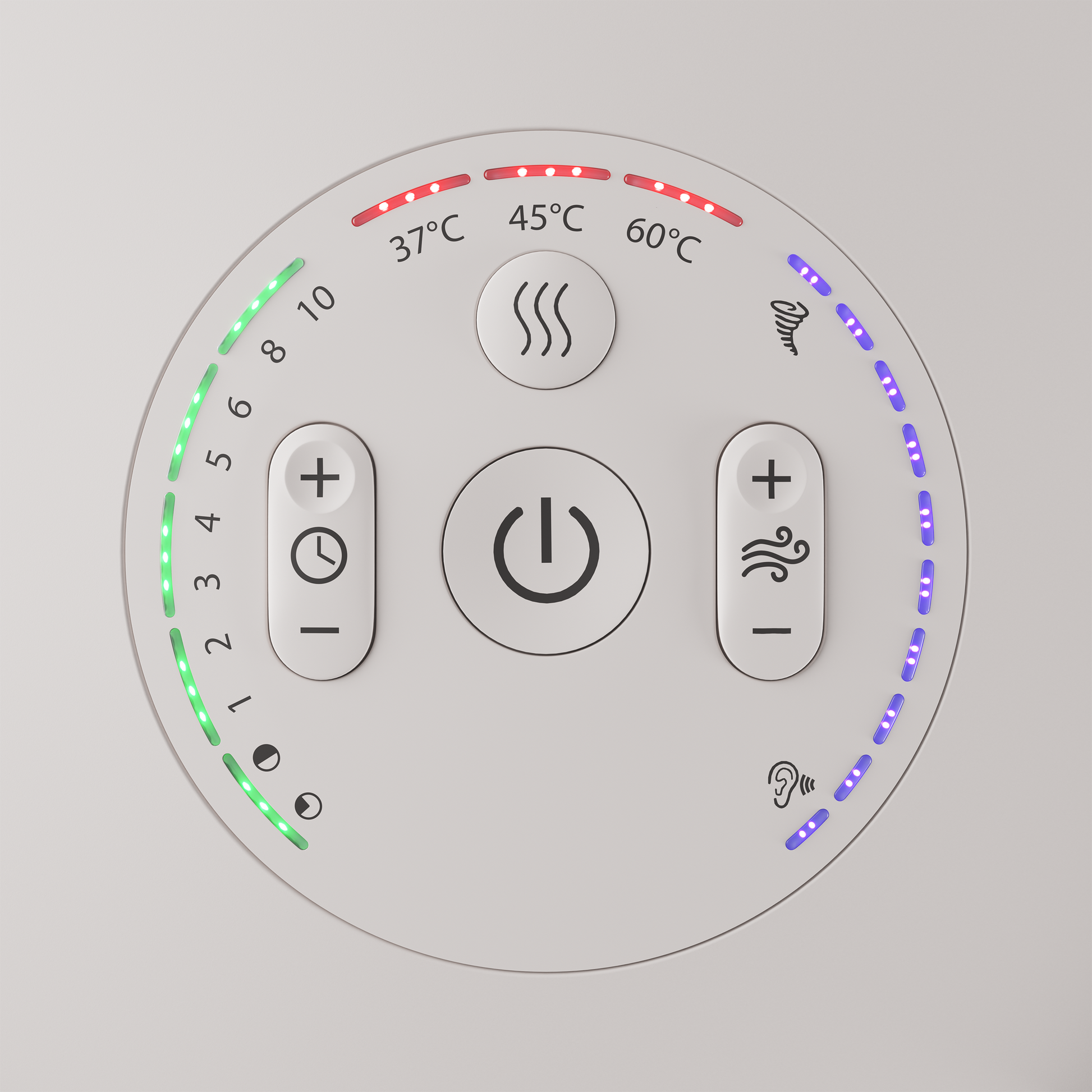 Justerbar varme (romtemperatur, 37°, 45°, 60° grader) med varmeinnstillinger for lær og sensitive materialer.